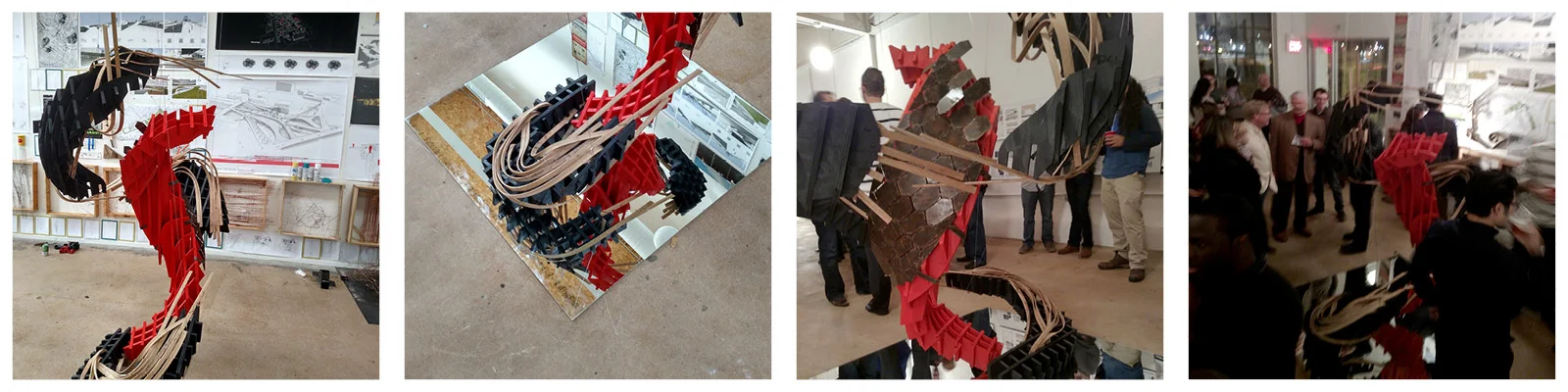 A section of the central “metal” form-work was wrapped with steel scales utilizing a pattern that would allow the sheet metal to bend in multiple directions. Steam bent White Oak allowed more fluidity and emotion to enter the piece.